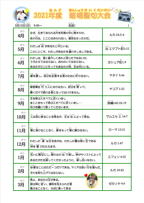 年度末の重要イベントは、暗唱聖句大会です!CSでは、毎月1箇所暗唱聖句を決めており、オリジナリティあふれるメロディを付けて、楽しく歌って覚えています😊そして3月前半の暗唱聖句大会で、幼稚科さん~ジュニアまでみんな、何個覚えられたかチャレンジです!「あ゛~!覚えたはずやのに、出てこうへーん!!」そんな時には、みんな大好き美声のヒーロー・ワードマンが、ヒントを出しに来てくれますよ(笑)✨覚えた数だけ飴ちゃんをもらって、達成感いっぱいで一年を締めくくります🍬