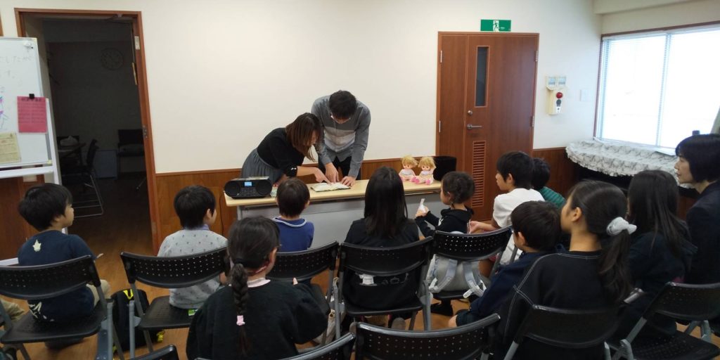 午前10時半~の主日礼拝の時間には、最初の賛美の後、幼稚科&キッズクラスのおともだちは再び3階に上がり、「キッズタイム礼拝」を行います。紙芝居、寸劇、パワポスライド…メッセンジャーは各自工夫を凝らし、子どもたちにもわかりやすく、聖書のメッセージを伝えています。(2階礼拝堂で主日礼拝の説教が終わったら、応答の賛美から再び、子どもたちもそちらに合流します。)