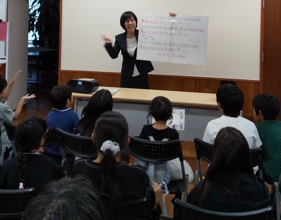午後からはみんな一緒の時間🎵集会では、手拍子や振り付けと共に元気いっぱい賛美の歌を歌い、ドラマセラピー(聖書寸劇)を見て笑い、神様のお話を聴き、お祈りをします。